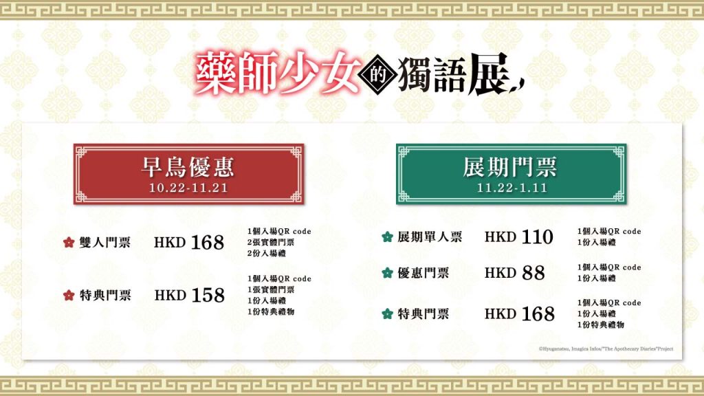 《藥師少女的獨語展》經日本巡迴後,海外首站將於11月22日登陸香港! 今次香港站特別展出限量主視覺圖,重現日本展覽的大部分細節,邀大家走入後宮世界,尋找貓貓與壬氏之間的甜蜜故事,感受這場奇幻又懸疑的後宮世界。