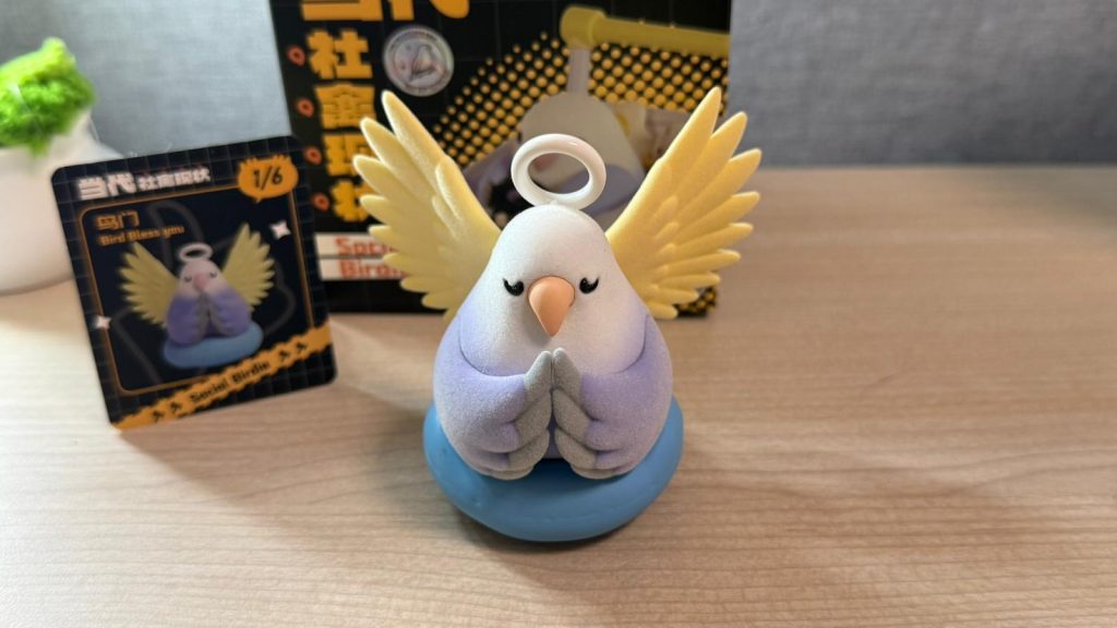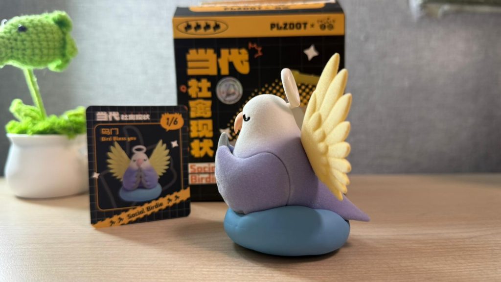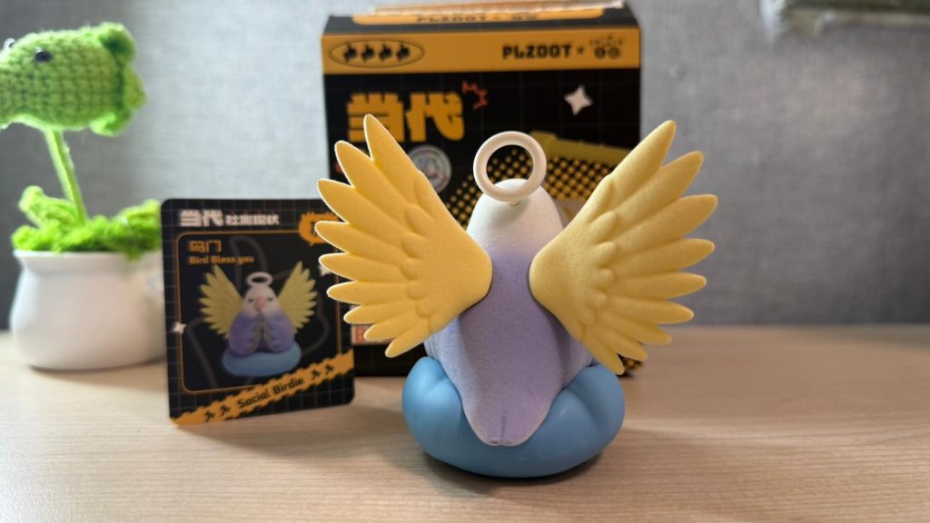第一次接觸PLZDOT的玩具,一開盒便被其做工經驗到。雀身及天使翅膀都輕輕包附薄薄的植絨,呈現小鳥羽毛的感覺。小鳥雙手合十、頭戴光環、雙眼閉上蹲坐在墊子上,神態似足被工作摧殘的打工仔,係度默念「莫生氣」。