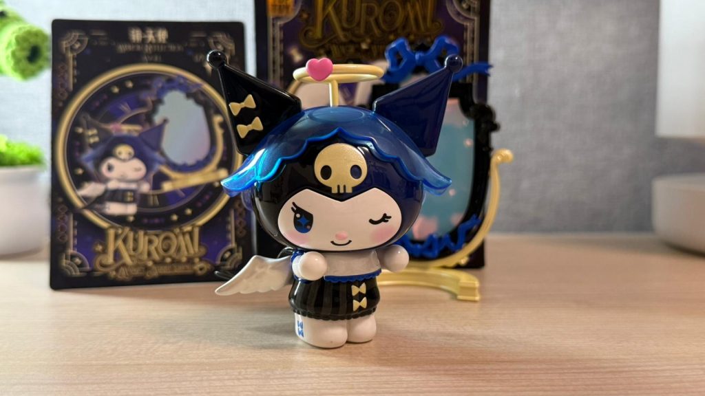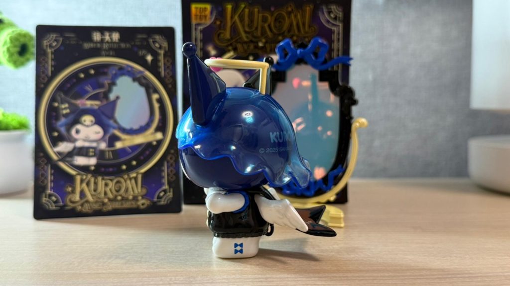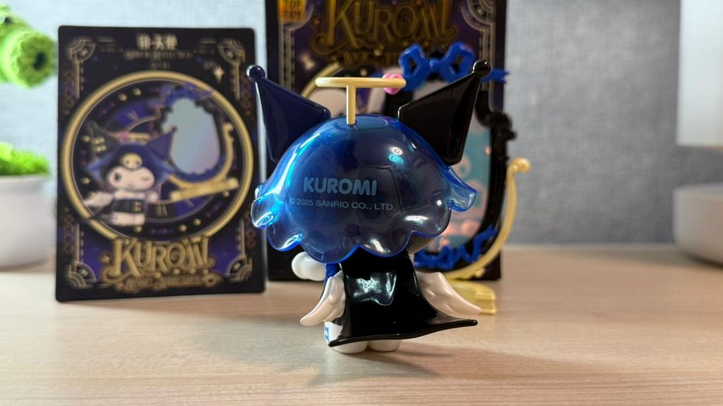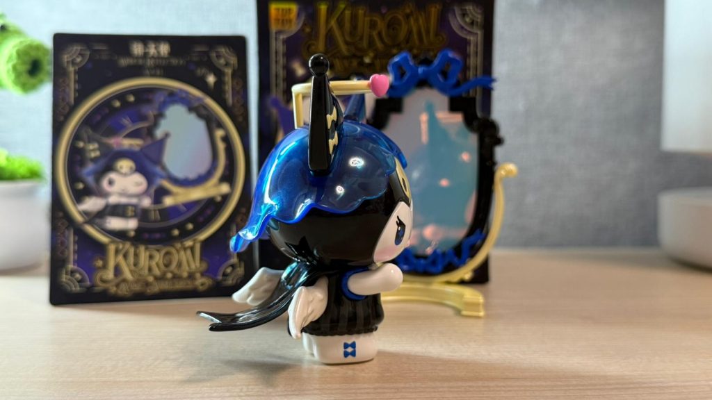 Kuromi 換上了藍黑色歌德風小短裙,頭上戴著有透明感的藍色帽子,當然少不了天使光環!身後披著亮黑色質感的披風,還有一對超可愛的小翅膀,整體暗黑又帶點純真 。最驚喜的是配件配埋一面可活動的迷你全身鏡子!鏡子的材質採用粉藍色珠光膠片,若隱若現的反光效果具有質感,又帶出魔術師的神秘感。